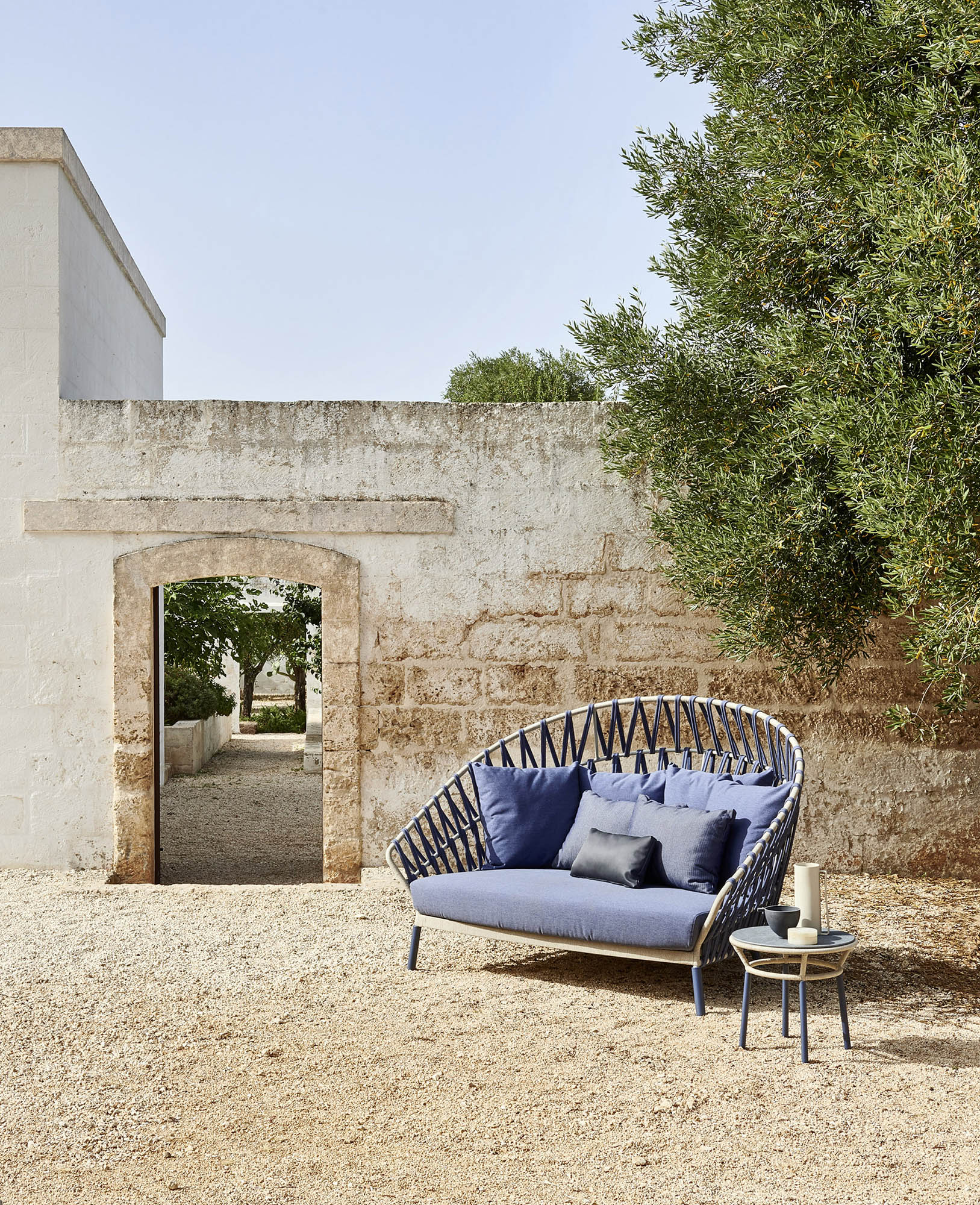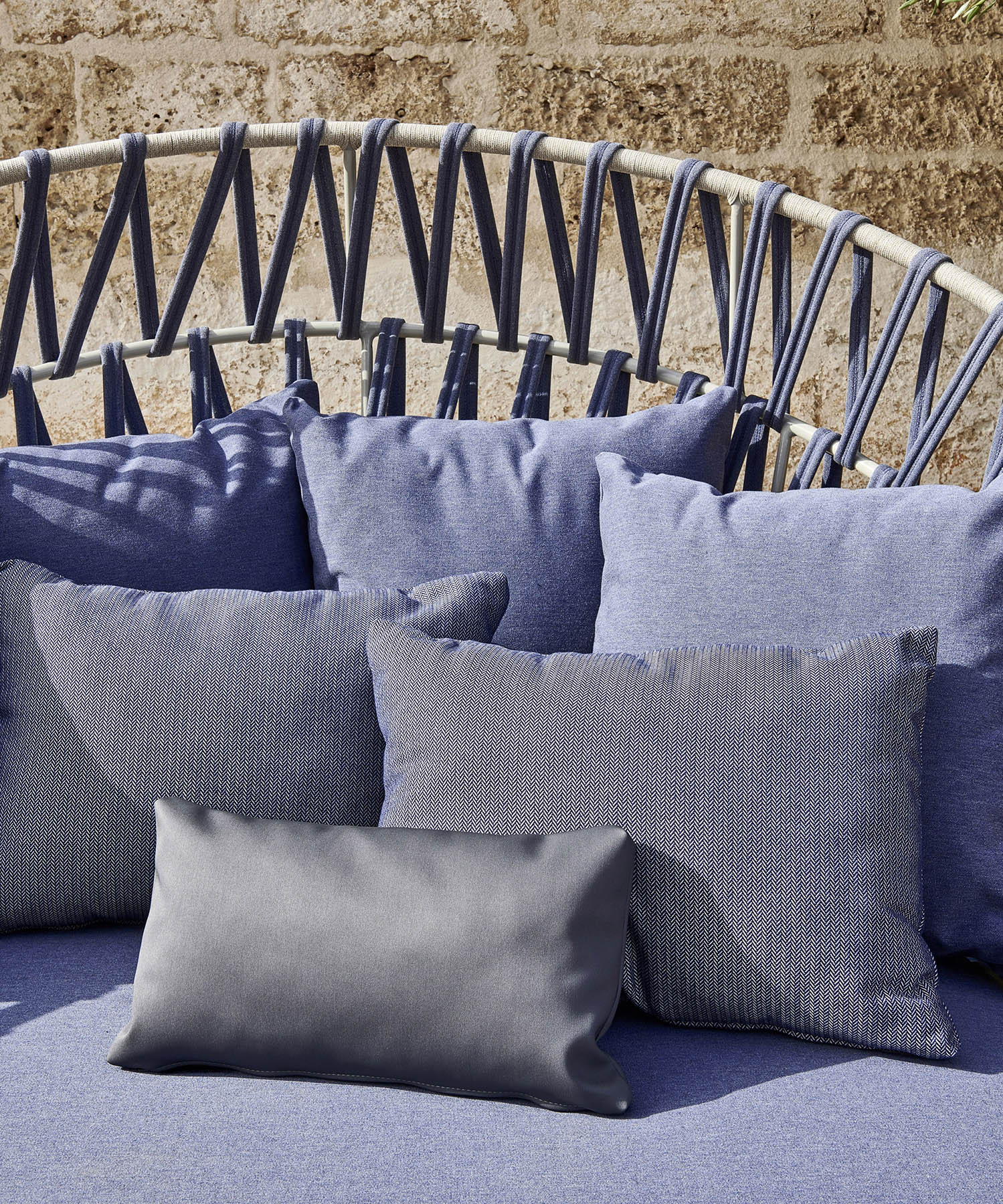 Die Idee eines Sofas trifft auf die eines Betts: und daraus wird sofort ein Daybed. Das Daybed aus der Emma Cross Kollektion zeichnet sich durch die einhüllende Nestartige Form des Rücken-Armlehnen-Ensembles aus, die sich durch das in Handarbeit auf die pulverbeschichteten Aluminiumstruktur gewobene Band auszeichnet. Das in Stoff bespannte Sitzkissen mit Outdoor-Dryfeel® Schaumstoff-Polsterung und die 7 Rückenkissen sind im Lieferumfang enthalten.