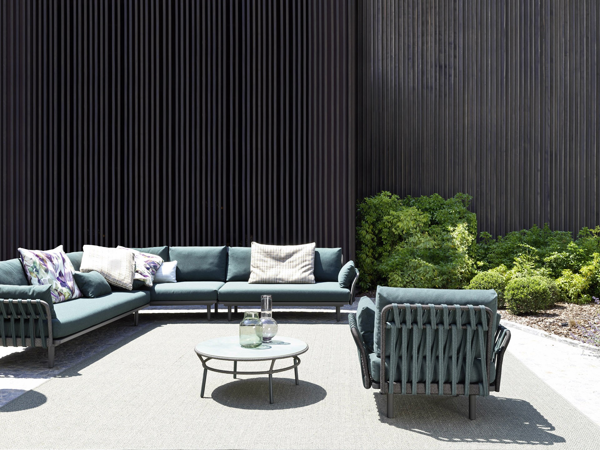 Gestell aus Aluminium. Rücken- und Armlehnen aus pulverlackiertem Aluminium, mit Bändern aus Acrylgewebe verflochten. Wetterfest und sonnenlichtbeständig (UV). Die Sitzfläche ist mit Dryfeel®-Outdoorschaum gepolstert, der Bezug lässt sich abnehmen.