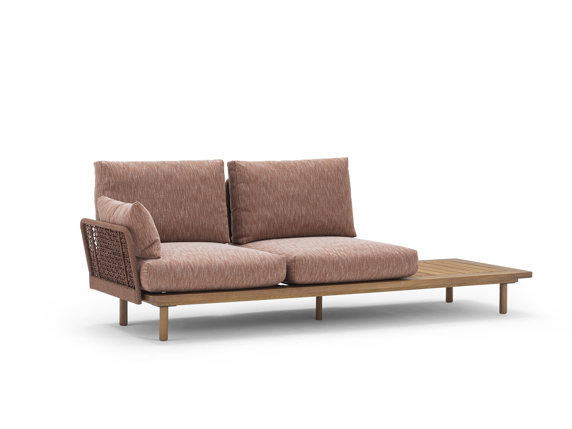 Das Gestell wird in Aluminium und in massivem Iroko-Holz angeboten. Das Kordelgeflecht der Rücken- und Armlehnen aus Polypropylen, einer Kunstfaser mit Polyesterkern, garantiert eine höhere Widerstandsfähigkeit und ist für den Außenbereich geeignet. Die verschiedenfarbigen Fäden, aus denen die Kordel besteht, erzeugen einen optischen Melange-Effekt. Platte aus HPL, gehämmerter Keramik oder Iroko-Holz. Wetterfest und sonnenlichtbeständig (UV). Die Sitzfläche ist mit Dryfeel®-Outdoorschaum gepolstert, der Bezug lässt sich abnehmen.