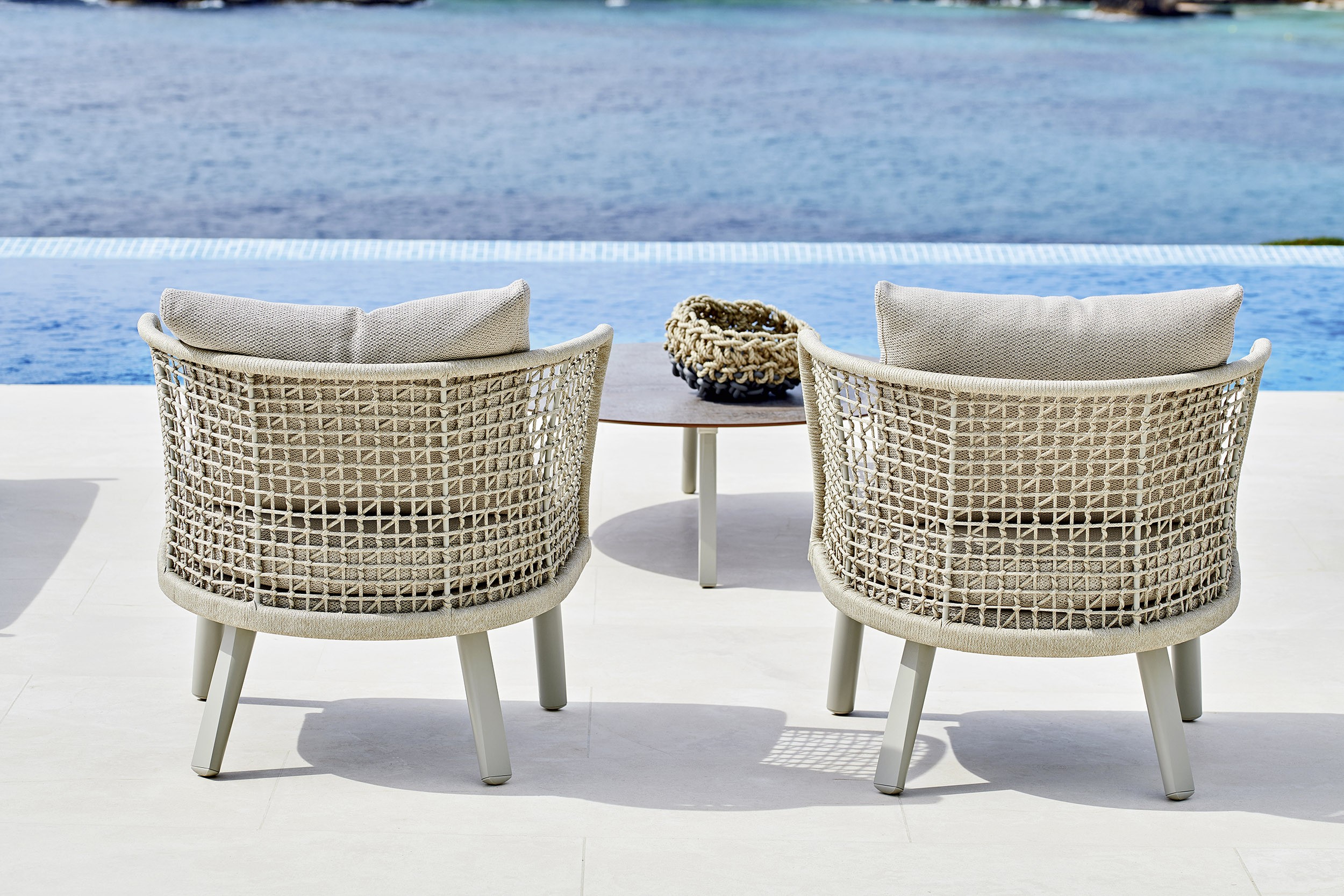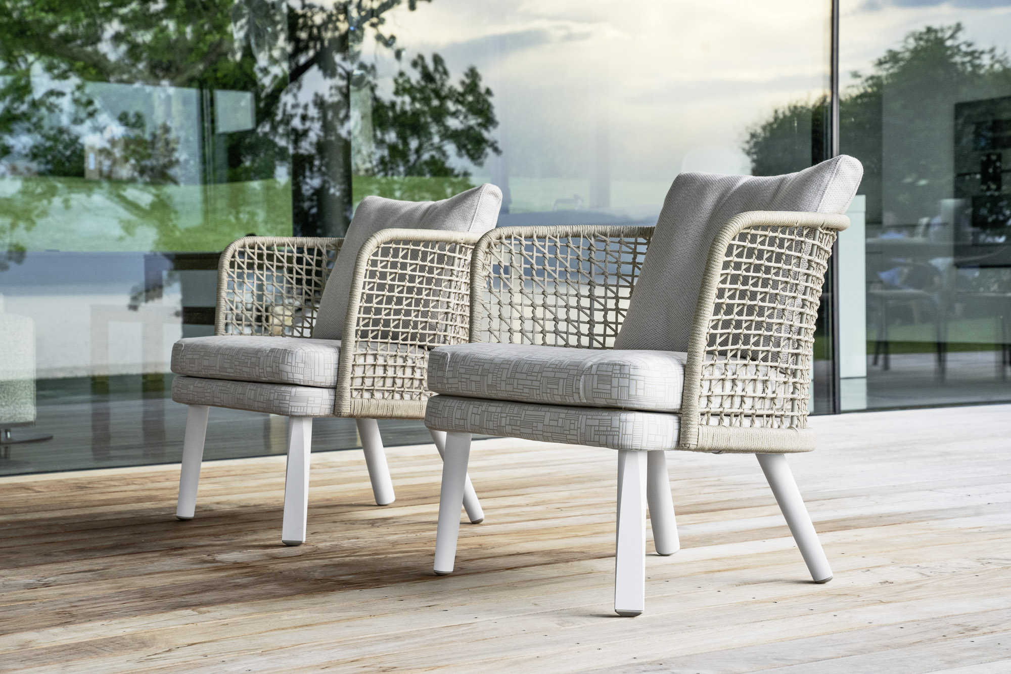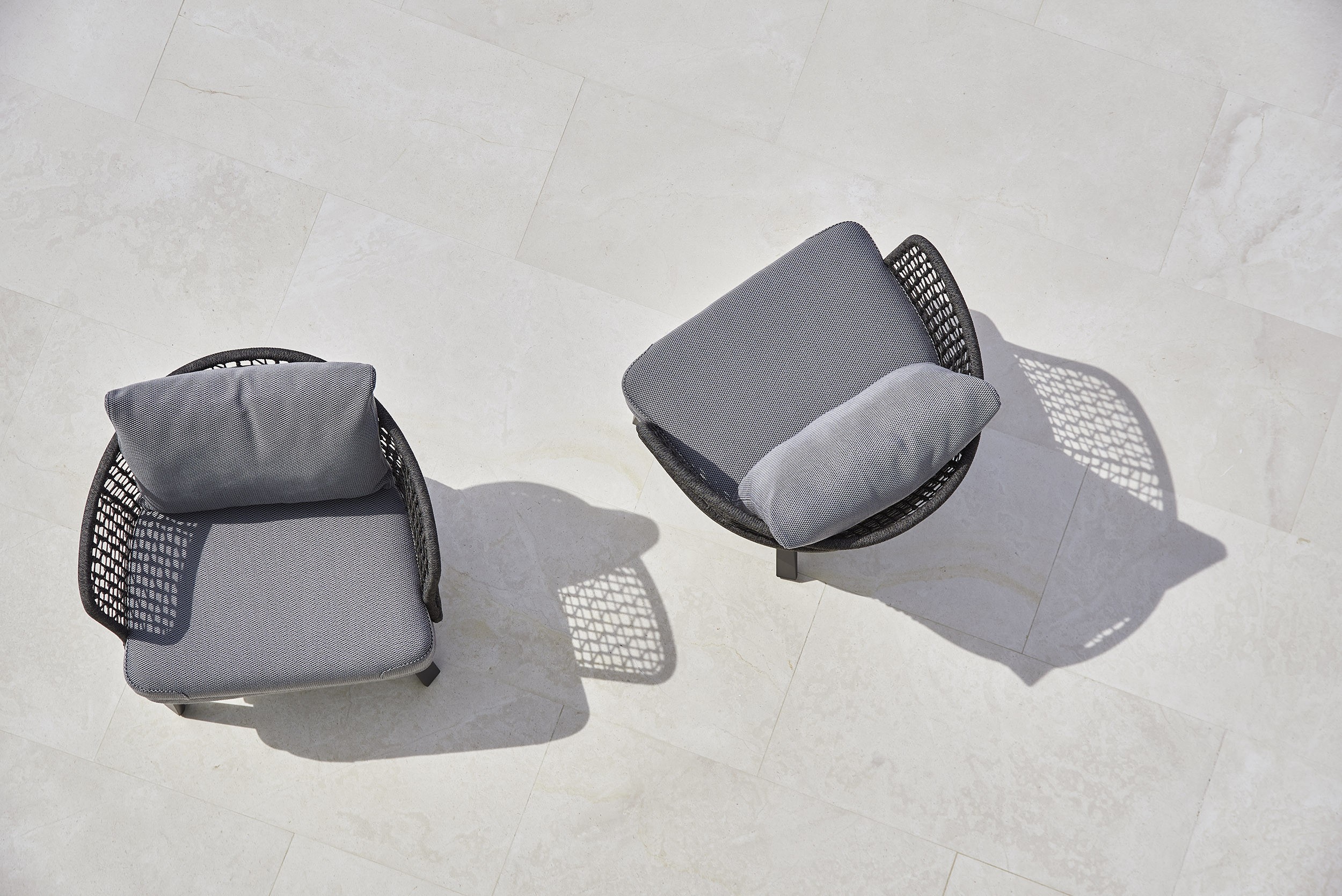 Eine Oberfläche mit einer leichten und luftigen Struktur, die aus einem Geflecht von miteinander verflochtenen Kordeln besteht, umhüllt den gesamten Sitz des Emma-Sessels wie eine Umarmung. Ein weiches Kissen ruht darauf, sodass Sie in jeder Position maximalen Komfort finden. Emma ist ein geräumiger und einhüllender Sessel, in den Sie eintauchen können. Er wurde für die unterschiedlichsten Umgebungen entwickelt, vom Garten bis zur Terrasse, von der Veranda bis zum Pool.
