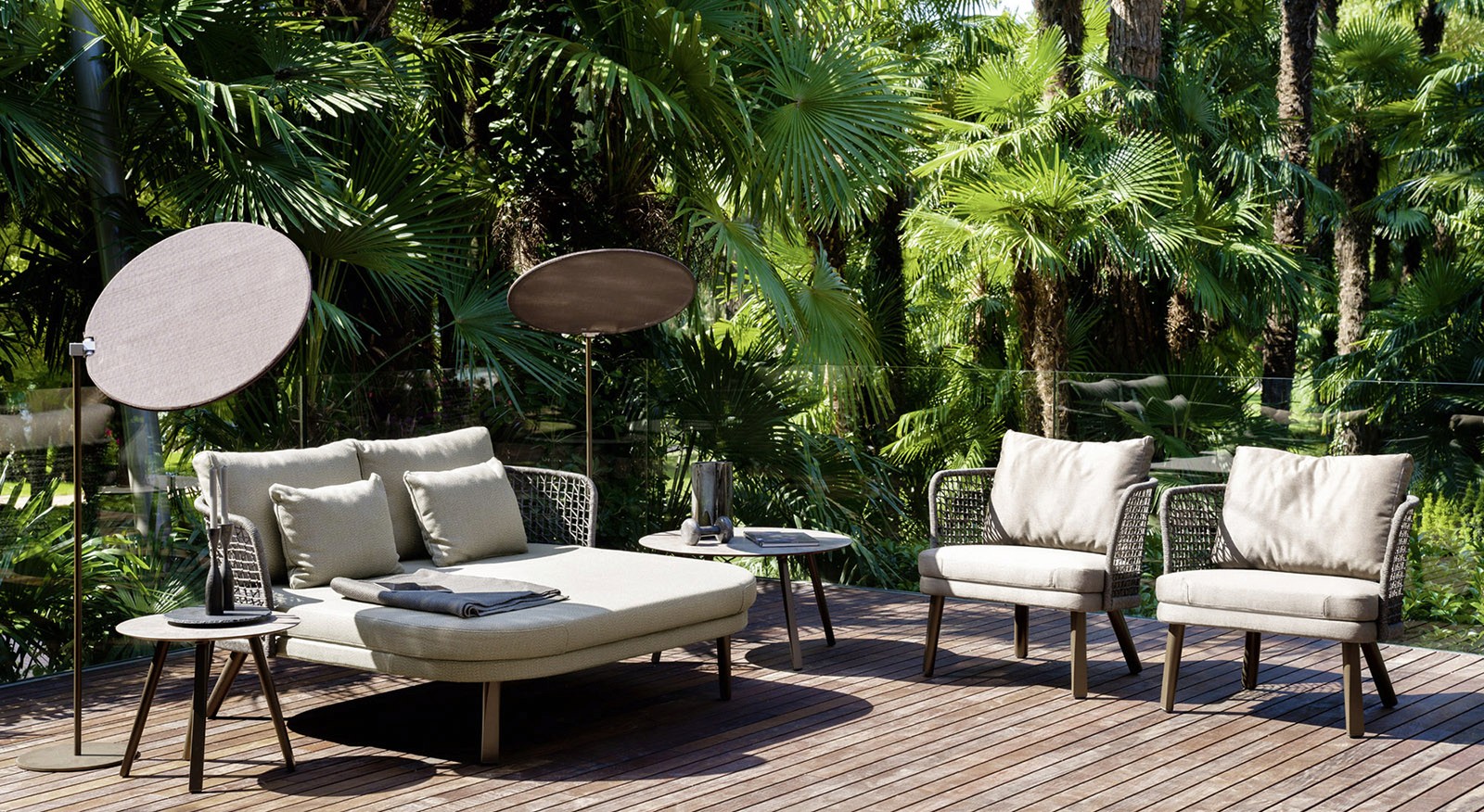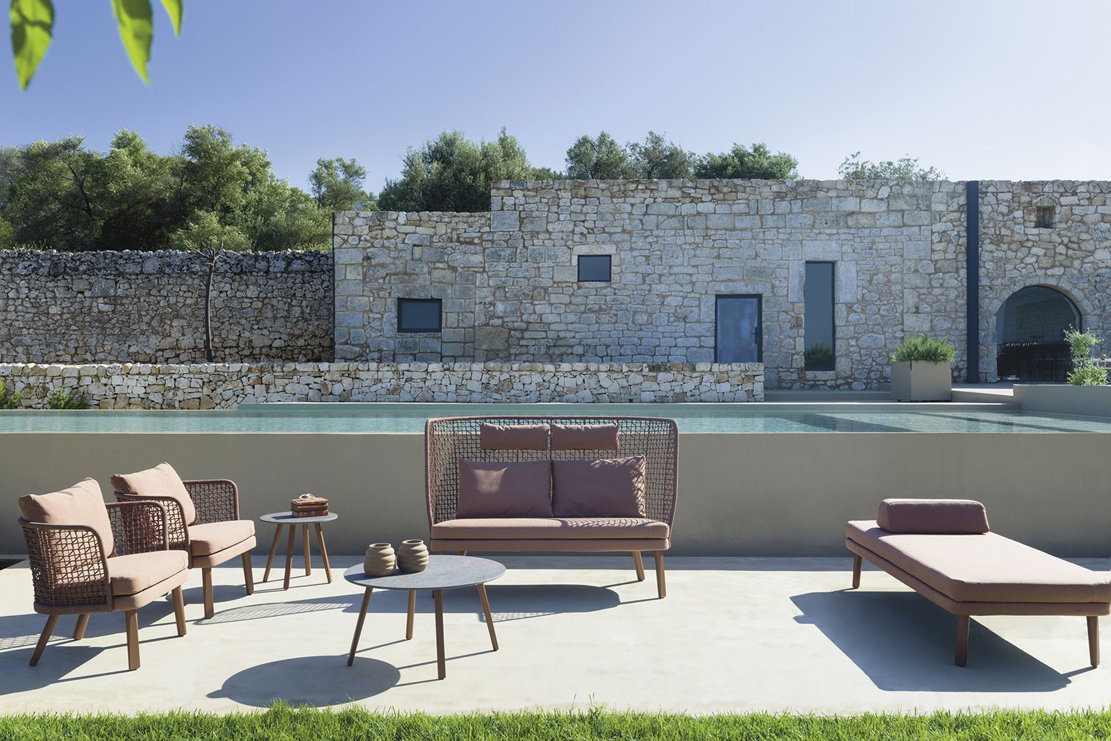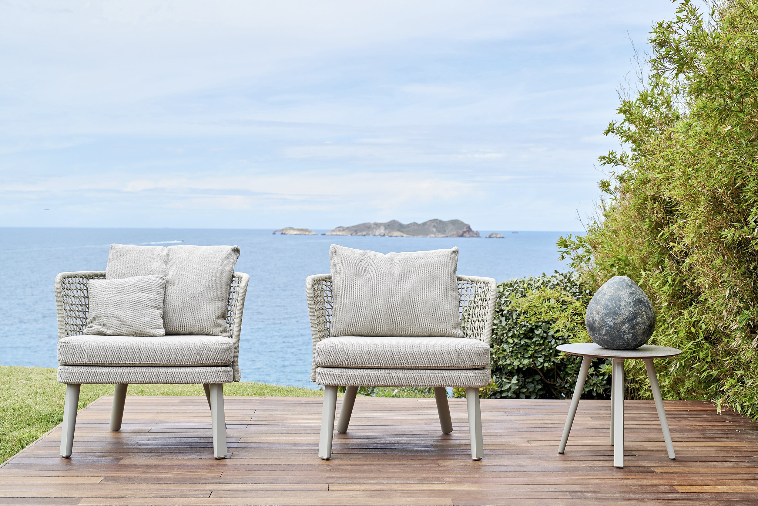 Eine Oberfläche mit einer leichten und luftigen Struktur, die aus einem Geflecht von miteinander verflochtenen Kordeln besteht, umhüllt den gesamten Sitz des Emma-Sessels wie eine Umarmung. Ein weiches Kissen ruht darauf, sodass Sie in jeder Position maximalen Komfort finden. Emma ist ein geräumiger und einhüllender Sessel, in den Sie eintauchen können. Er wurde für die unterschiedlichsten Umgebungen entwickelt, vom Garten bis zur Terrasse, von der Veranda bis zum Pool.