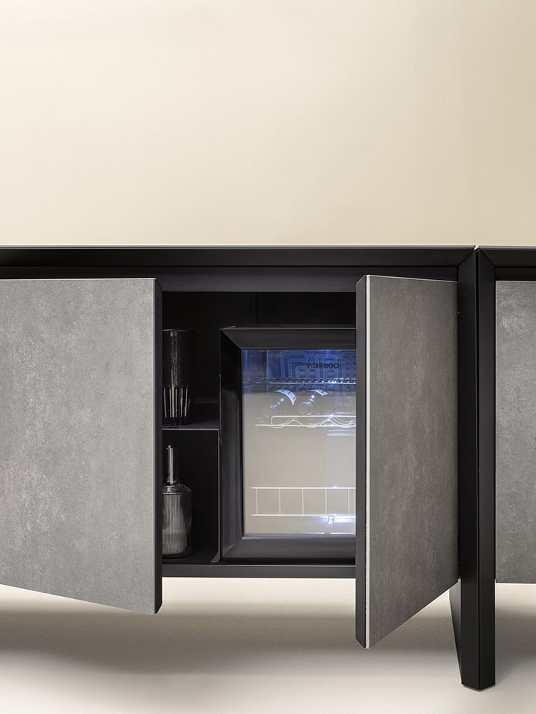 Struktur in Schwarz erhältlich. Türen und Abdeckplatte aus aufgesetzter Keramik in der Farbe Dark Stone erhältlich.