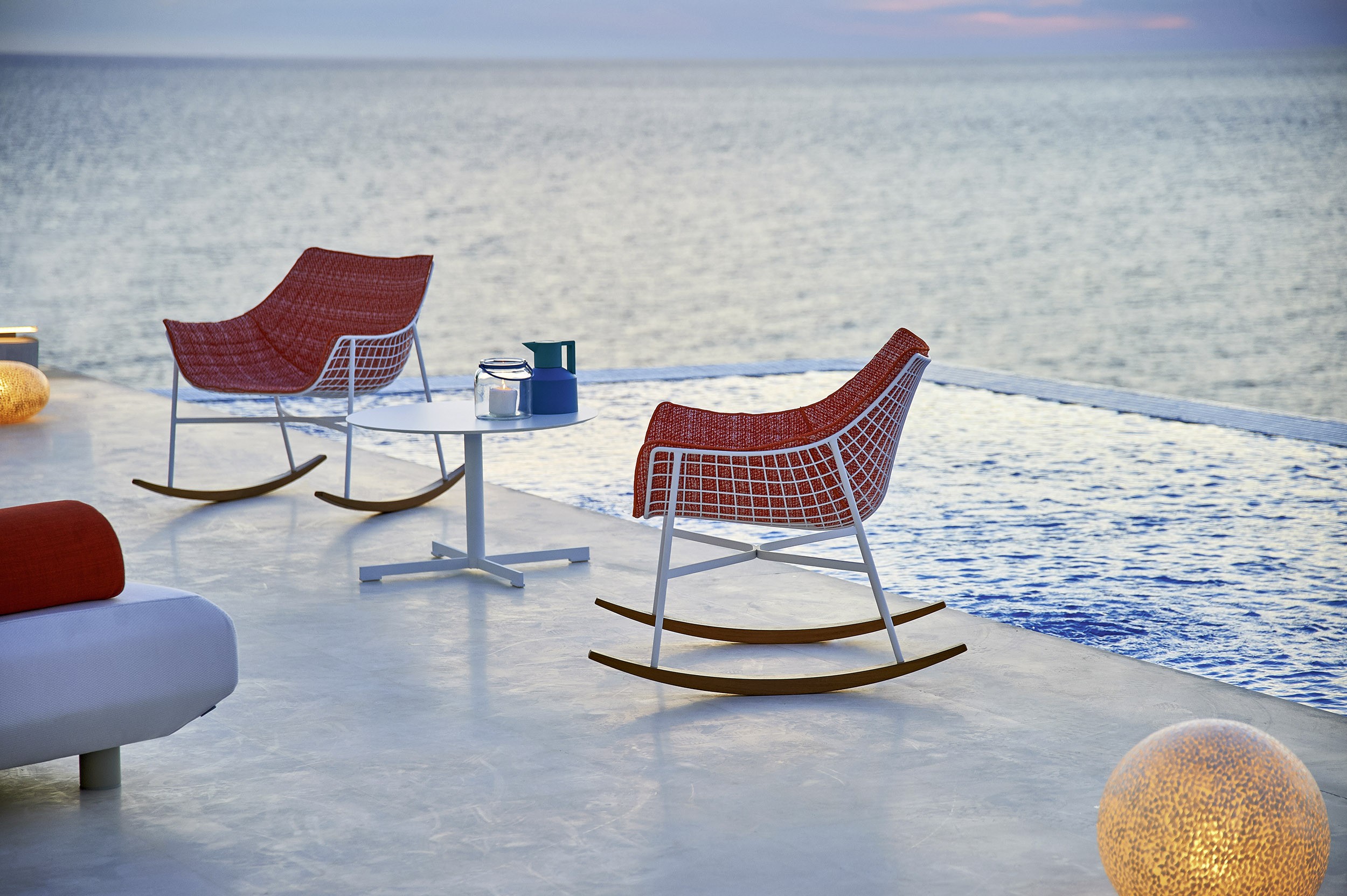 Lassen Sie sich auf dem Schaukelstuhl Summer Set schaukeln. Dies ist der beste Weg, um sich im Freien zu entspannen. Sein Design voller Persönlichkeit verbindet Modernität und Tradition und experimentiert mit den ausdrucksstarken Möglichkeiten, die neue Formen von Geflecht ermöglichen. Die Stahldrahtstruktur ist mit einer C5M-Schutzbehandlung pulverbeschichtet, wodurch der Summer Set-Schaukelstuhl ideal für die Bestückung einer Außenfläche mit Blick auf das Meer oder einen Pool ist.